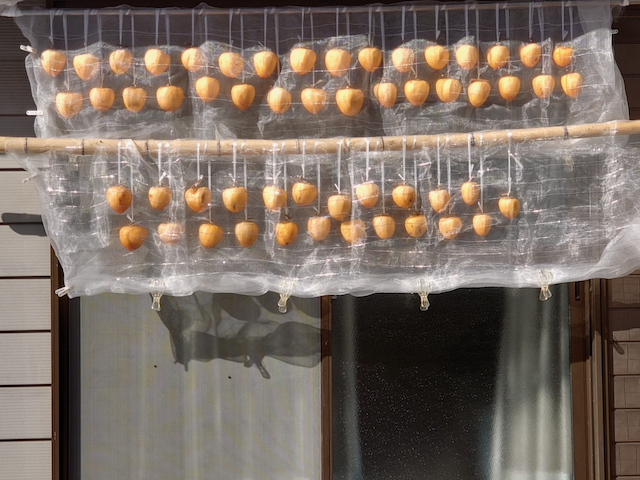 庭にある蜂谷柿を高枝切り鋏で収穫し、夜鍋仕事で皮を剥いて、翌日の朝、焼酎に浸してから干します。