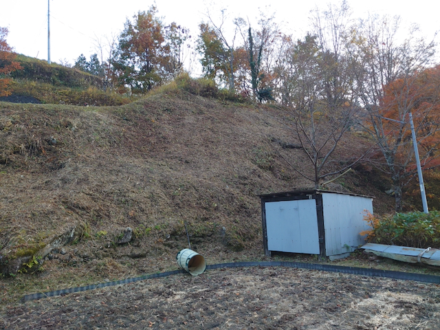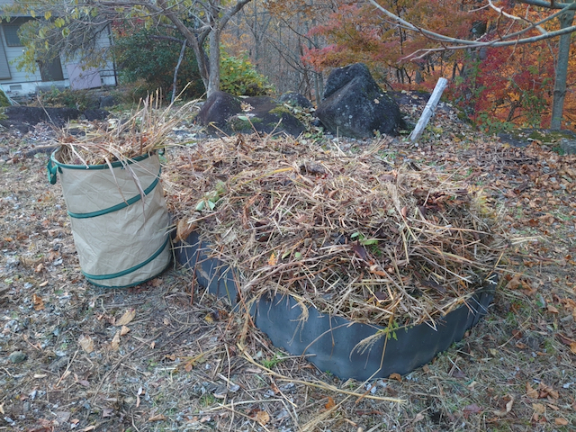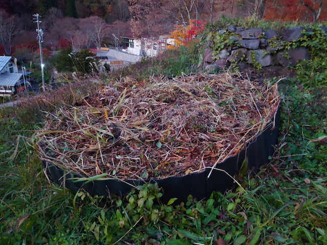 運んだら堆肥場に入れて、を繰り返し、山盛りになったら足で踏み込んで、また運んで写真の様に山盛りにします。