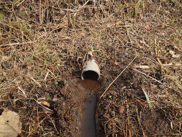 ぬかるんでいる原因を調べてみると、水口からチョロチョロとずっと水が入っている状況で、これではいつまで経っても乾きません。