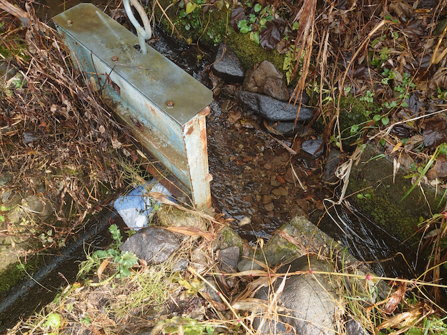 本来、この分水栓は水路を流れる水の量が多ければ、水圧で蓋が押し付けられて水が入らない構造ですが、どこからか湧いているくらいの水量(写真)では押し付けられません。