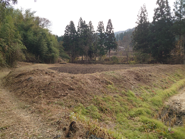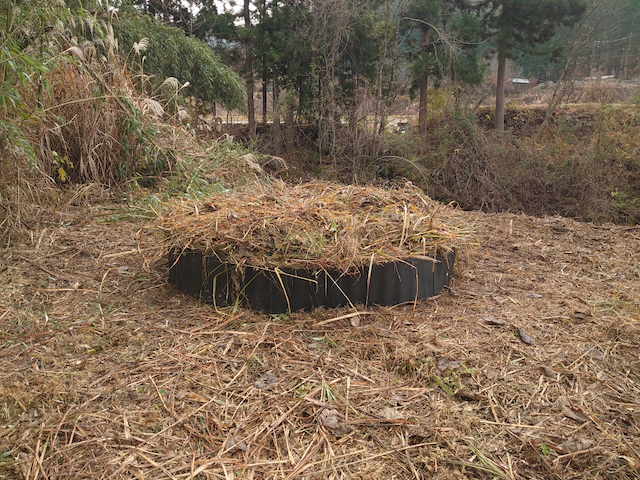 刈った草は来年の秋耕起で入れる堆肥にする為に、圃場のすぐ横の薮を刈り払って畦並板で囲って堆肥場を作って、そこに運び入れました。
