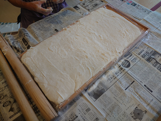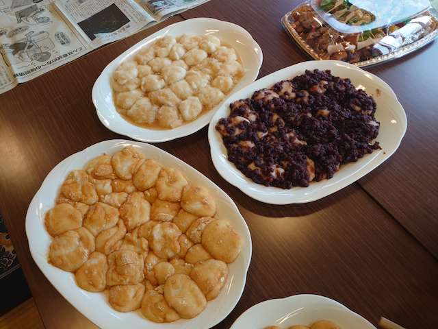 ここまで2臼つきましたが、つき上がると調理場で素早く小さく千切って、きな粉餅、大根餅、小豆餅と、それぞれの味に仕立てていきます。