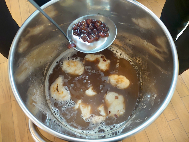 作っていただいたぜんざいの汁に、その砕いた餅を入れて、少し煮込むと・・・。