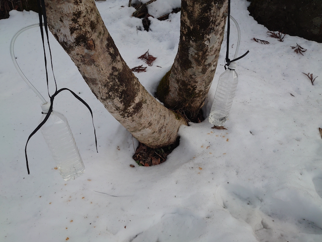 1月の半ば、雪があるうちにイタヤカエデから樹液を採取します。