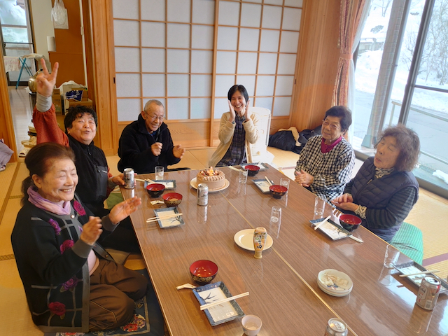 この時期はまだ雪が有るので「景観づくり」の作業は無しで、会食とお誕生日会のみを行いました。(お誕生日会は、一昨年の忘年会から行なってます。)