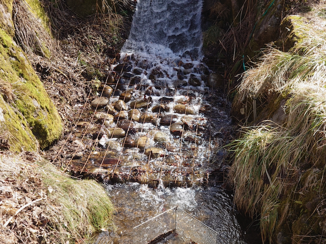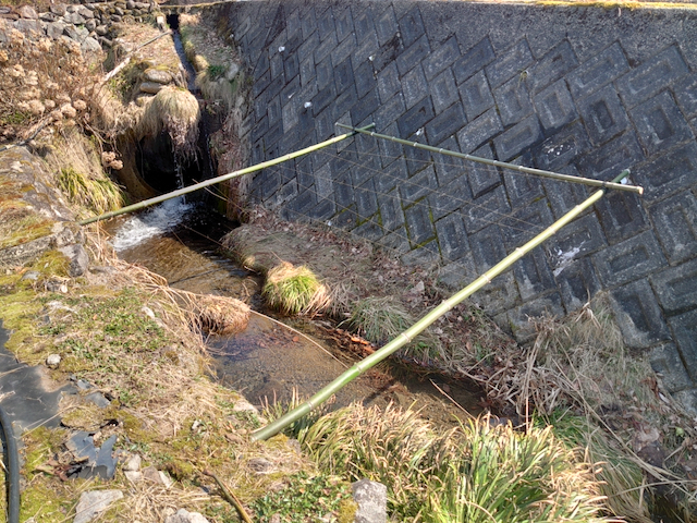 田んぼに水を取っている沢には、水の勢いを抑える為に蛇籠が設置してあります。