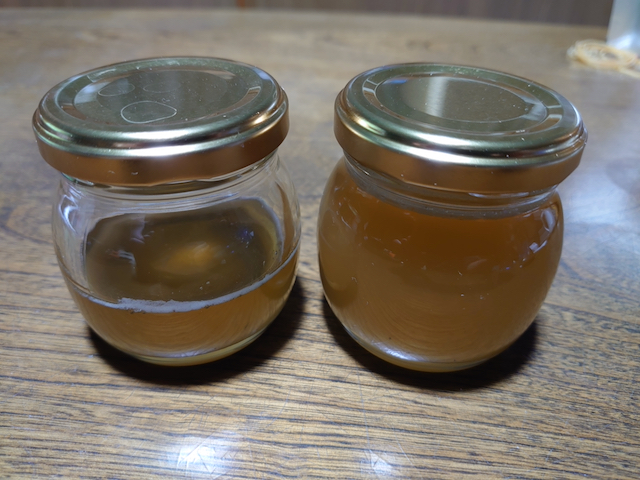 1.5リットルが6本で9リットルの樹液から、写真の小さなジャムの瓶で1個と半分。
