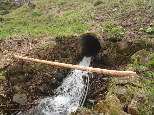 我が家の田んぼは、この沢からポリパイプで水を送っているのですが、それを支える木の支柱が腐って折れていたのです。