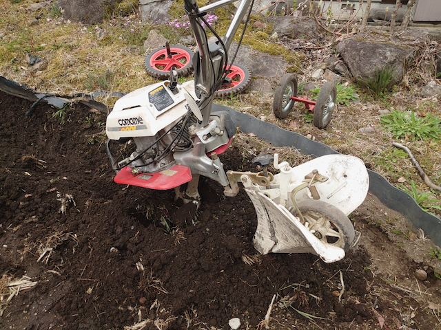 なので、せっかく管理機で耕すのだから培土機を片方に寄せる様にして『耕しながら土を退かせられないか?』と試してみたのですが、残念ながら狙った様に出来なくて却下。