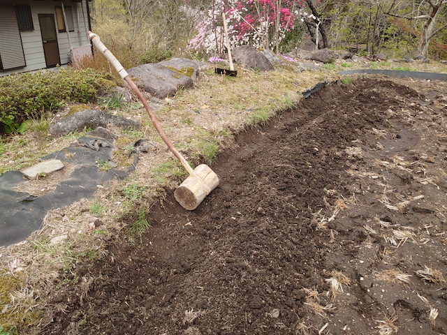 土を退かして木槌で叩く・・・のですが、今日は少しやり方を変えてます。