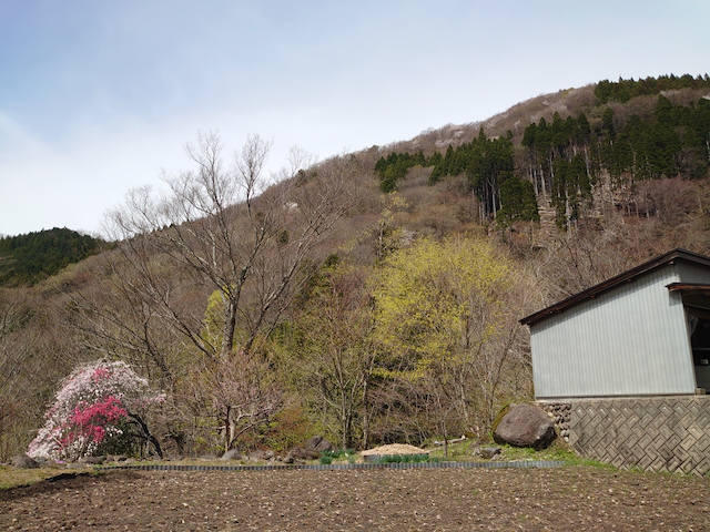 見上げると山の上の方にヤマザクラ、近くにはハナモモ。