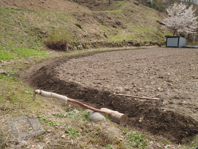 桜まつりの翌日ですが、理由も無く焦る気持ちを満足させるべく(?)、田んぼの準備の第一弾として畦整備を行いました。
